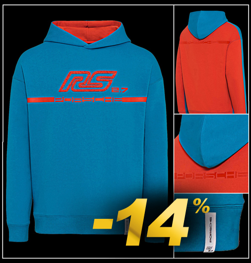 Hoodie homme Porsche RS 2.7 Hoodie avec capuche doublée - Couleur Bleu / Orange Matière 50% Coton / 50% Polyester Porsche WAP955NRS2