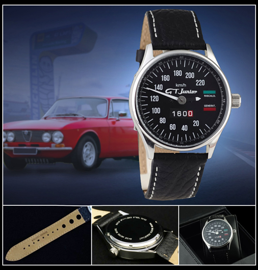 Montre compteur de vitesse Alfa Romeo Giulia 1600 GT Junior - 220 km/h Mouvement quartz Miyota Japan - Bracelet cuir noir / surpiqures blanches Boitier en acier - Verre plat - Fond vissé - Diamètre 41 mm - Epaisseur 10 mm Bracelet 22 mm - Etanche 10 ATM / 100m - Livré dans sa boite de présentation en cuir Made in Germany 159,95 € TTC / Incl. Taxes
