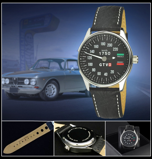 Montre compteur de vitesse Alfa Romeo 1750 GTV - 220 km/h Mouvement quartz Miyota Japan - Bracelet cuir noir / surpiqures blanches Boitier en acier - Verre plat - Fond vissé - Diamètre 41 mm - Epaisseur 10 mm Bracelet 22 mm - Etanche 10 ATM / 100m - Livré dans sa boite de présentation en cuir Made in Germany 159,95 € TTC / Incl. Taxes