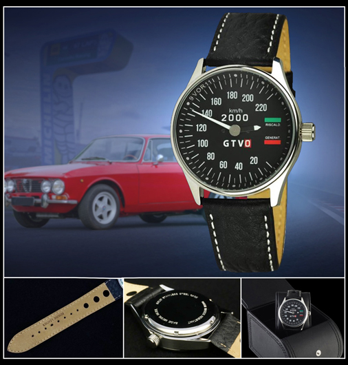Montre compteur de vitesse Alfa Romeo 2000 GTV - 220 km/h Mouvement quartz Miyota Japan - Bracelet cuir noir / surpiqures blanches Boitier en acier - Verre plat - Fond vissé - Diamètre 41 mm - Epaisseur 10 mm Bracelet 22 mm - Etanche 10 ATM / 100m - Livré dans sa boite de présentation en cuir Made in Germany 159,95 € TTC / Incl. Taxes