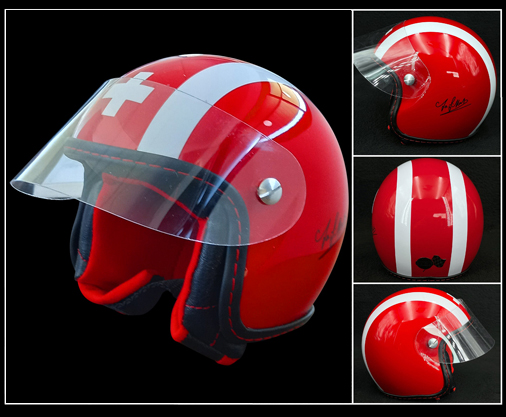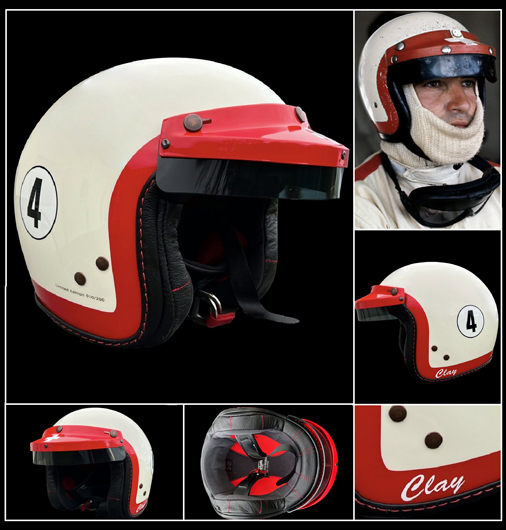 Casque Clay Regazzoni - Vainqueur Grand Prix F1 Monza 1970 Certification CE pour utilisation sur la route (hors U.S.A.) Matière Coque 100% polycarbonate - Doublure Terinda avec cuir écologique Fermeture par boucle double - Pare-soleil intégré à la visière Couleur Crème / Rouge - Housse de transport nylon noire Made in Italy - Edition limitée - 200 exemplaires