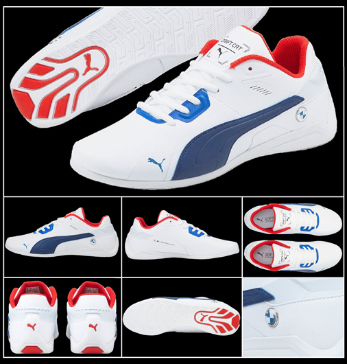 Chaussures homme BMW Drift Cat Delta by Puma Dessus Cuir synthétique - Doublure Textile - Semelle Caoutchouc Coupe basse - Lacets ronds - Couleur Blanc / Bleu / Rouge Puma 307100-02