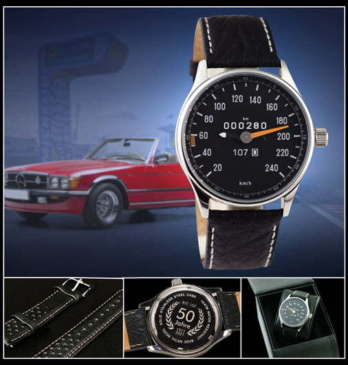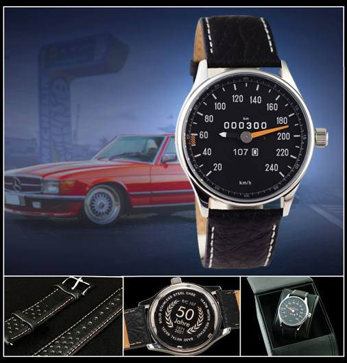Montre compteur de vitesse Mercedes-Benz 500 SL - 240 km/h Mouvement quartz Miyota Japan - Bracelet cuir noir / surpiqures blanches Boitier en acier - Verre plat - Fond vissé - Diamètre 41 mm - Epaisseur 10 mm Bracelet 22 mm - Etanche 10 ATM / 100m - Livré dans sa boite de présentation en cuir Made in Germany 159,95 € TTC / Incl. Taxes