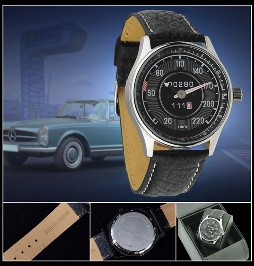 Montre compteur de vitesse Mercedes-Benz 280 SL - 240 km/h Mouvement quartz Miyota Japan - Bracelet cuir noir / surpiqures blanches Boitier en acier - Verre plat - Fond vissé - Diamètre 41 mm - Epaisseur 10 mm Bracelet 22 mm - Etanche 10 ATM / 100m - Livré dans sa boite de présentation en cuir Made in Germany 159,95 € TTC / Incl. Taxes