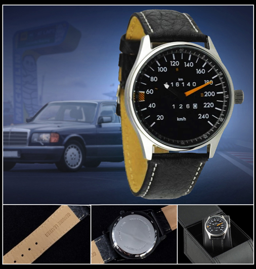 Montre compteur de vitesse Mercedes-Benz W126 - 240 km/h Mouvement quartz Miyota Japan - Bracelet cuir noir / surpiqures blanches Boitier en acier - Verre plat - Fond vissé - Diamètre 41 mm - Epaisseur 10 mm Bracelet 22 mm - Etanche 10 ATM / 100m - Livré dans sa boite de présentation en cuir Made in Germany 159,95 € TTC / Incl. Taxes