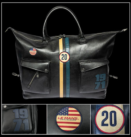 Sac de Voyage Steve McQueen Le Mans Cuir embossé Steve McQueen à l'arrière - Bande cuir bleu et blanc cassé Grand contenant principal spacieux avec fermeture par zip 2 poches à pression et 1 zippée sur le devant - 2 anses non réglables Couleur : Noir - Dimensions : 54 x 47 x 24 cm. env. Cuir de haute qualité - Matière : Cuir de mouton Classic Legend Motors - 27950-1504