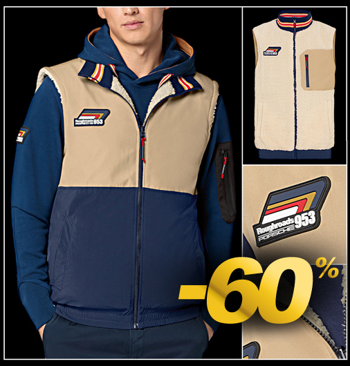 Veste sans manches réversible homme Porsche 953 Roughroads Un côté en Nylon léger et robuste et un côté en fourrure douce Matière 100% Polyester - Couleur Beige / Bleu Marine - 2 poches latérales Fermeture principale zippée - Taille élastiquée Porsche WAP163PRRD