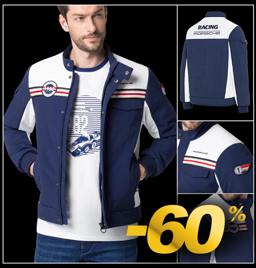 Veste homme Porsche Racing Fermeture par zip et pressions - 2 poches latérales - 1 poche intérieure zippée 1 poche sur la poitrine - Couleur Bleu / Blanc / Rouge - Matière 100% Nylon Porsche WAP453NRTM