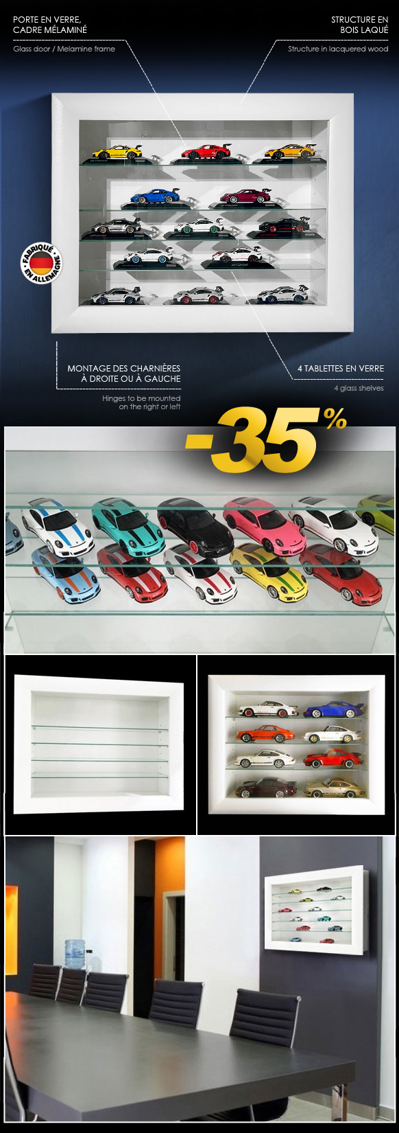 Vitrine Murale Pour 8 à 60 miniatures Porsche à l'échelle 1/43 1/24 1/18 Finition remarquable - Porte en verre encadrée en mélaminé Magnifique profil arrondi - Montage facile avec notice claire et détaillée Montage des charnières à droite, à gauche ou en haut Maintien de la porte par aimant - Plaques de fixations fournies Supports de tablettes garnis de caoutchouc antidérapant LxHxP : 62,5 x 50 x 17,3 cm