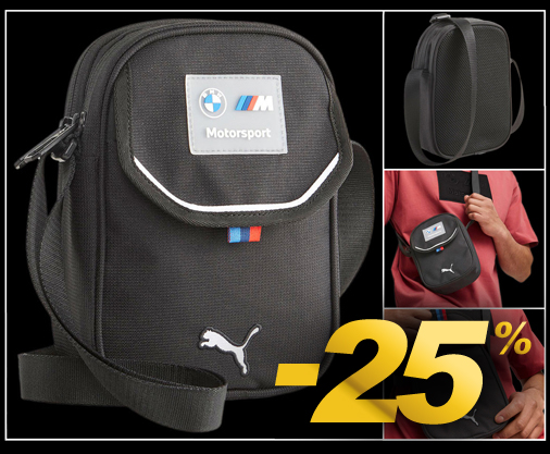 Sacoche à bandoulière BMW Motorsport by Puma Compartiment principal zippée - Bandoulière réglable - Poche à rabat sur l’avant Porte-cartes à l’intérieur - Couleur Noir - Dimensions 15 x 21 x 6,5 cm Puma 079844_01
