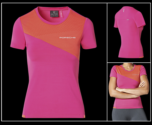 T-shirt Femme Porsche Sport collection Tissu élastique, léger et respirant / Séchage rapide - Couleur Rose / Orange Matière 86% polyester / 14% élasthanne Porsche WAP53900M0SP 64,95 € TTC / Incl. Taxes