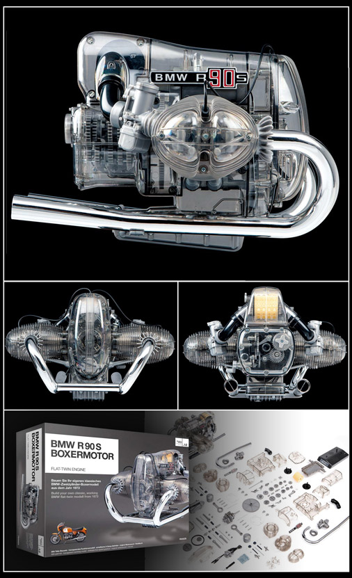 Moteur BMW R 90 S Boxer 2 Cylindres 1973 - Réplique entièrement fonctionnelle 200 pièces à monter soi-même - Socle de présentation inclus Boite 5 vitesses fonctionnelle - Bouton de mise en marche avec cycle "son et lumières" Reproduction sonore du moteur - Fonctionne avec 3 piles AAA Superbe manuel illustré en anglais et allemand - Echelle 1/2 199,95 € TTC / Incl. Taxes