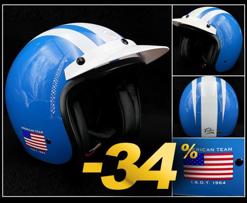 Casque Vintage Inspiration Steve McQueen Matière Coque 100% polycarbonate - Visière démontable - Passage intégré pour les écouteurs Boucle de fermeture double D renforcée en métal inoxydable - Livré avec sa housse Habillage intérieur en cuir synthétique perforé - Couleur Bleu / Blanc / Noir
