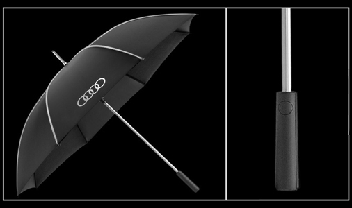Parapluie Audi XL Matière 100% Polyester - Diamètre ouvert 120 cm - Couleur Noir / Argent Housse de rangement imperméable - Poignée avec bouton de déverouillage Audi 3122200100 39,95 € TTC / Incl. Taxes
