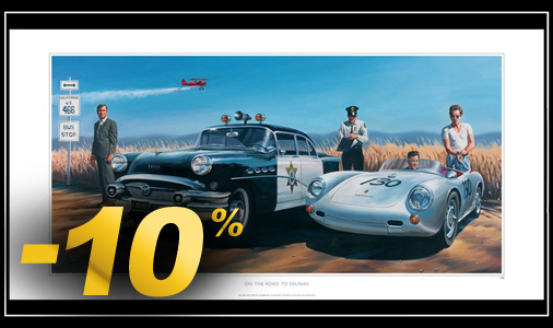 Reproduction d'une peinture originale de Benjamin Freudenthal Porsche 550, James Dean 100 x 50 cm - Papier 300 g/m2 verni anti-UV Série limitée 350 exemplaires numérotés et signés