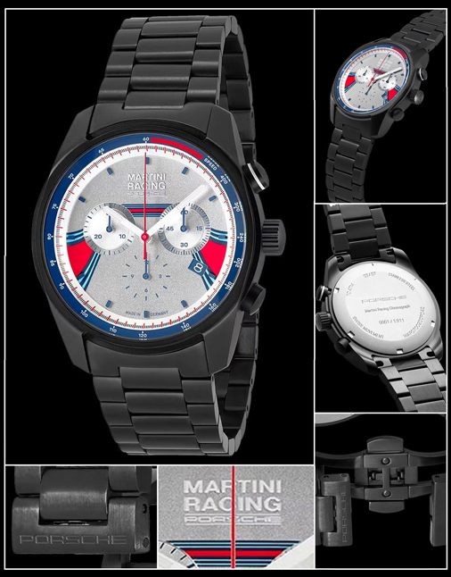Montre Porsche Chrono Sport Martini Racing Mouvement Suisse RONDA 13 rubis - Bracelet en acier inoxydable avec liens brossés et polis Aiguilles luminescentes - Dos gravé avec numéro de série - Etanche à 100 mètres / 10 ATM Bracelet en acier inoxydable - Verre antireflets saphir - Fonction Stop intégrée Montage du bracelet et réglage de la longueur par deux goupilles à ressort Diamètre 37 mm - Epaisseur 12 mm - Garantie 2 ans Fabriqué en Allemagne - Porsche WAP0700200P042 699,95 € TTC / Incl. Taxes