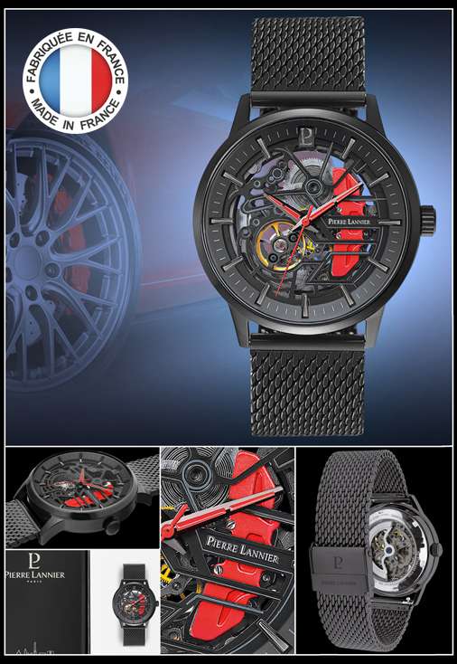 Montre automatique Pierre Lannier Paddock Fond cadran squelette - Représentation d'un étrier de frein - Bracelet en acier milanais Boitier en acier inoxydable noir - Verre antireflets saphir - Couleur Noir / Rouge Etanche à 50 mètres - Diamètre 43 mm - Garantie 2 ans Made in France - Pierre Lannier 338A439 279,95 € TTC / Incl. Taxes