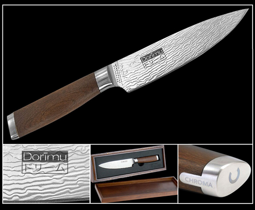 Couteau de Cuisine Japonais Dorimu Pure Damas Pure Damas 64 couches VG10/VG2 / Fabrication entièrement artisanale - Longueur 23 cm Aiguisage ambidextre en V aigu pour un tranchant immédiat - Poids 86 g Manche ergonomique en érable norvégien très dur Chroma D-01