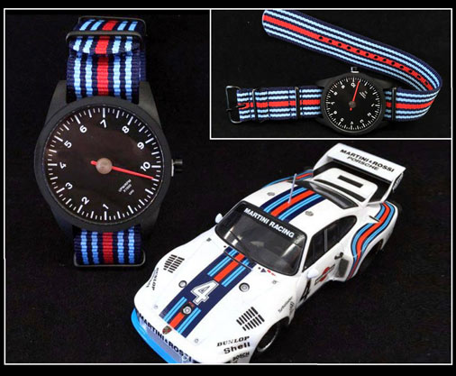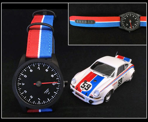Montre compte-tours Porsche 911 mono-aiguille - Tricolore Mouvement quartz Ronda 762 Swiss-made Bracelet course en toile bleu, rouge, marine Boitier en acier inoxydable PVD noir Saphir très résistant, traité anti-rayures et anti-reflets Etanche jusqu'à 10 ATM Diamètre 43 mm Garantie 12 mois Livré dans sa boite de présentation 349,95 € TTC / Incl. Taxes