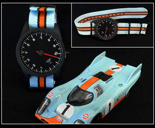 Montre compte-tours Porsche 911 mono-aiguille - Bleu Gulf Mouvement quartz Ronda 762 Swiss-made Bracelet course en toile bleu, orange, noir Boitier en acier inoxydable PVD noir Saphir très résistant, traité anti-rayures et anti-reflets Etanche jusqu'à 10 ATM Diamètre 43 mm Garantie 12 mois Livré dans sa boite de présentation 349,95 € TTC / Incl. Taxes