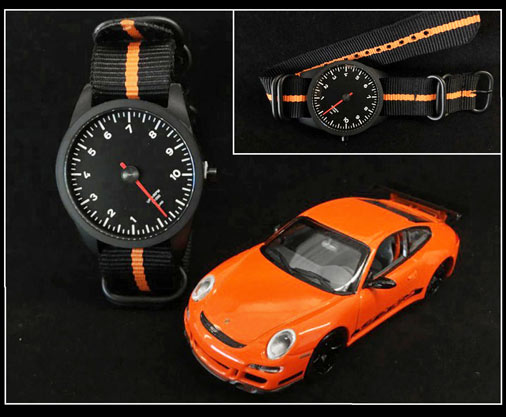 Montre compte-tours Porsche 911 mono-aiguille Mouvement quartz Ronda 762 Swiss-made Bracelet en toile orange, noir Boitier en acier inoxydable PVD noir Saphir très résistant, traité anti-rayures et anti-reflets Etanche jusqu'à 10 ATM Diamètre 43 mm Garantie 12 mois Livré dans sa boite de présentation 349,95 € TTC / Incl. Taxes