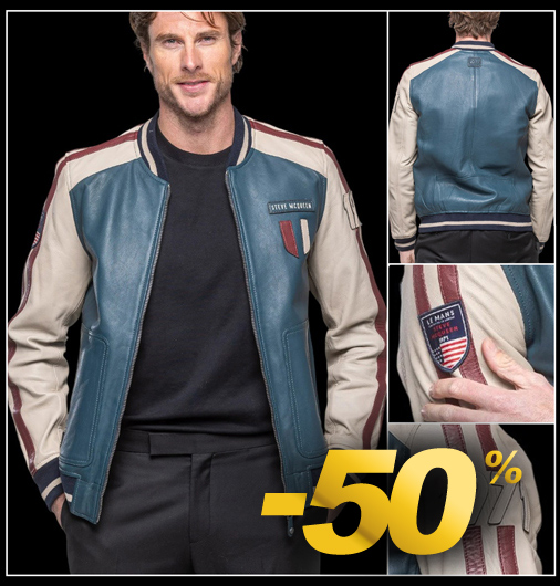 Veste en Cuir homme 24h Le Mans Steve McQueen Matière 100% cuir de mouton - Doublure 100% Coton - Fermeture zippée 2 Poches latérales zippées - Couleur Bleu royal / Beige / Bordeaux Classic Legend Motors 27504-0012