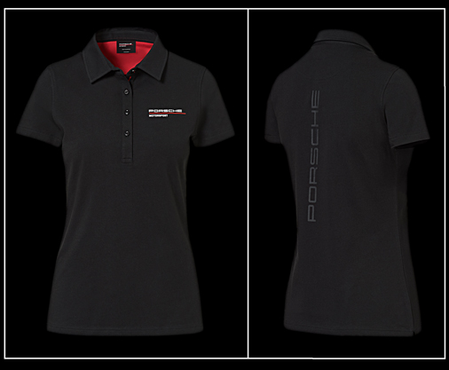Polo femme Porsche Motorsport Couleur noir / détails rouge / blanc - Matière 95 % coton / 5 % elasthane Tissu technique élastique confortable et respirant Porsche WAP806LFMS 59,95 € TTC / Incl. Taxes