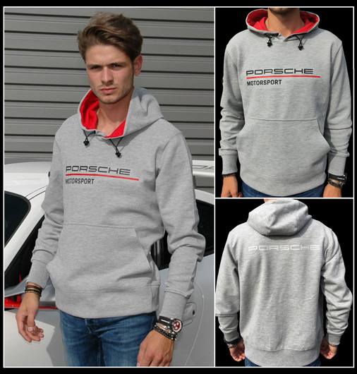 Sweatshirt à capuche homme Porsche Motorsport Couleur gris clair / détails rouge / noir - Matière 44% Coton / 56% Polyester Grande poche devant avec 2 entrées latérales - Capuche avec lacet Porsche WAP816LFMS 94,95 € TTC / Incl. Taxes