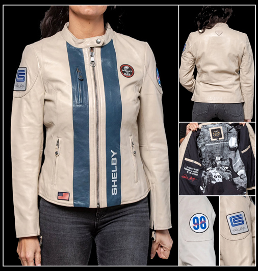 Veste en cuir femme Shelby Cobra Matière 100% Cuir - Doublure 100% Coton - Fermeture zippée - 3 Poches zippées Col droit - 1 poche intérieure - Manches zippées - Couleur Beige écru / Bleu Classic Legend Motors 27425-2001 439,95 € TTC / Incl. Taxes