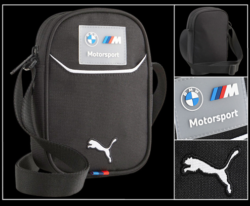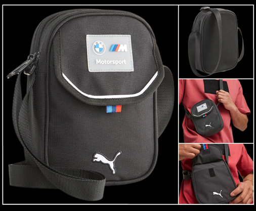 Sacoche à bandoulière BMW Motorsport by Puma Compartiment principal zippée - Bandoulière réglable - Poche à rabat sur l’avant Porte-cartes à l’intérieur - Couleur Noir - Dimensions 15 x 21 x 6,5 cm Puma 079844_01 39,95 € TTC / Incl. Taxes