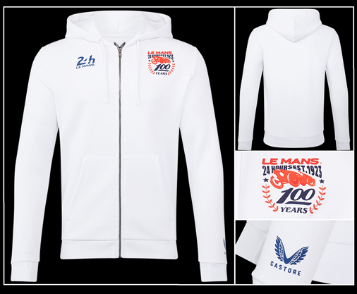 Hoodie homme 24h Le Mans 100 Ans Fermeture principale zippée - Capuche réglable par cordon de serrage Matière 80% Coton / 20% Polyester - Couleur Blanc 79,95 € TTC / Incl. Taxes