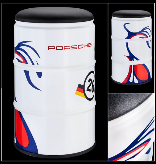 Siège Porsche 911 GT1 n°26 - Vainqueur 24h Le Mans 1998 Réplique d'un baril de pétrole - Utilisation en intérieur ou en extérieur Assise rembourrée - Revêtement simili cuir - Tonneau en métal Hauteur 60 cm - Diamètre 40 cm - Poids 10 kg Made in Germany - Porche WAP0501050RSFS 339,95 € TTC / Incl. Taxes