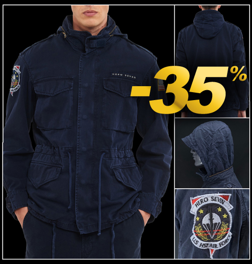 Veste à capuche homme US HS7 Air Force Coupe droite ajustable grâce à ses cordons de serrage 2 poches poitrine et 2 poches pression - Matière 100% coton Badges brodés - Couleur Bleu Marine Hero Seven E22219