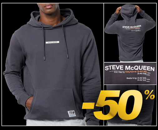 Hoodie homme Steve McQueen Chrono Inscription des temps au tour de Steve McQueen à Daytona et à Sebring en 1970 au dos Couleur Gris Foncé - Matière 100% coton Hero Seven H22406