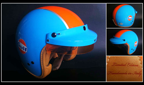 Casque demi-coque avec visière courte Gulf Casque sûr et solide, fabriqué en Europe aux normes CEE 2205 Couleur : bleu / orange - Matière : Coque 100% polycarbonate Doublure : Terinda avec cuir écologique Intérieur microfibre, cuir et nylon - couleur cognac Housse de transport nylon orange Fabrication artisanale italienne - Edition limitée