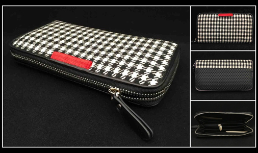 Portefeuille Wallet 911 Classic Pepita 8 compariments cartes - 2 poches à billets - 1 poche porte-monnaie Matière Vinyl Basketweave / tissu pied de poule / cuir Ceintures de 911 GT3 RS en décoration Fermeture éclair métalliques - Dimensions 20 x 11 x 3 cm 149,95 € TTC / Incl. Taxes