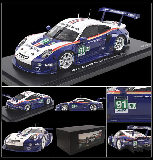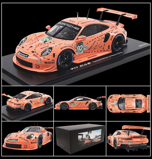 La très attendue Porsche 991 RSR "cochon rose" vainqueur en classe GT au Mans 2018 est disponible à l'échelle non seulement au 1/18 mais aussi au 1/12. Ne manquez pas l'occasion et soyez le premier à recevoir ce modèle d'exception.