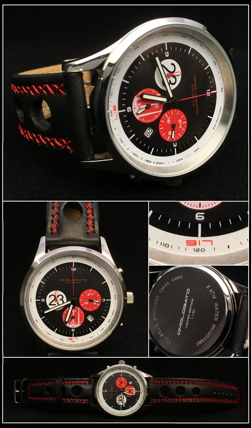 Montre Chronographe 917 K Salzburg n°23 Mouvement quartz Miyota Japan Bracelet perforé en cuir italien noir / surpiqué rouge Boitier en acier inoxydable chromé - Couronne vissée Etanche 5 ATM / 50m - Diamètre 43 mm - Garantie 24 mois Livré dans sa boite de présentation Série limitée - 200 exemplaires numérotés