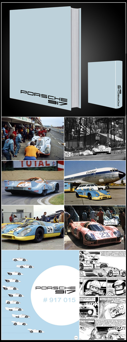 Livre "Porsche 917" Français / English - 568 pages - Nombreuses illustrations couleur et N/B Couverture rigide toilée sous coffret toilé Dimensions 27 x 31 cm - Année 2019 - Auteur : Laurent Gauvin Edition limitée - 917 exemplaires numérotés 450 € TTC / Incl. Taxes