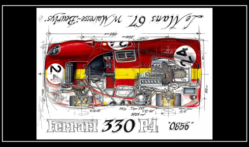 Reproduction d'un dessin original de Sébastien Sauvadet Ferrari 330 P4 n°24 - 24h Le Mans 1967 Dimensions : 30 x 40 cm - Papier 250 g/m2 Edition limitée - 330 exemplaire numérotés 29,95 € TTC / Incl. Taxes