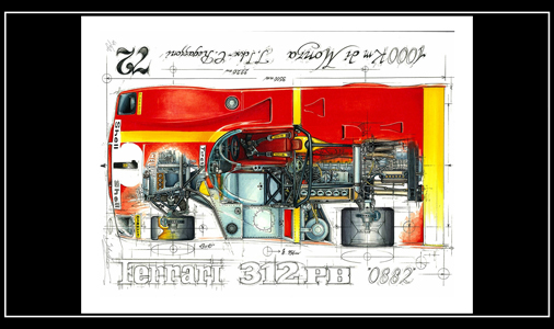 Reproduction d'un dessin original de Sébastien Sauvadet Ferrari 312 PB n°1 - 1000km Monza 1972 Dimensions : 30 x 40 cm - Papier 250 g/m2 Edition limitée - 312 exemplaire numérotés 29,95 € TTC / Incl. Taxes