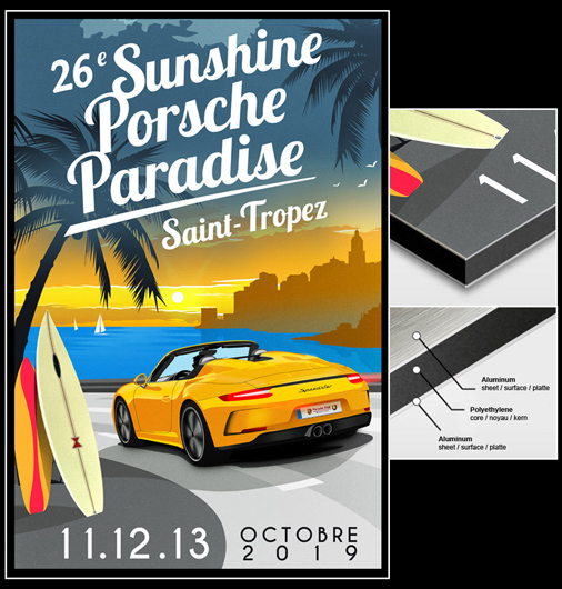 Reproduction de l'affiche originale du Paradis Porsche Saint Tropez 2019 40 x 60 cm - Impression sur plaque d'aluminium Kit d'accrochage vendu séparément 59,95 € TTC / Incl. Taxes