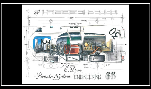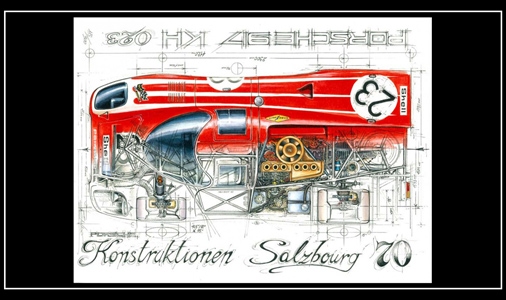 Reproduction d'un dessin original de Sébastien Sauvadet 917 Salzbourg n°23 - Vainqueur 24h du Mans 1970 Dimensions : 30 x 40 cm Edition limitée - 300 exemplaires numérotés et signés 29,95 € TTC / Incl. Taxes