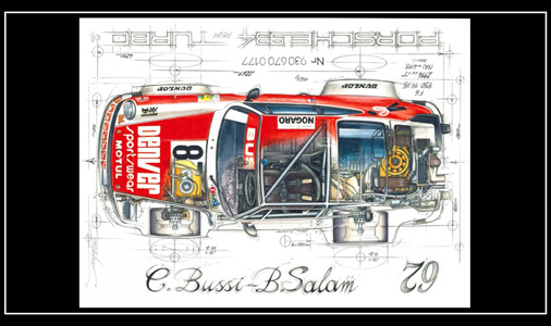 Reproduction d'un dessin original de Sébastien Sauvadet 934 Turbo RSR n°87 - 24h du Mans 1979 Dimensions : 30 x 40 cm Edition limitée - 200 exemplaires numérotés et signés 29,95 € TTC / Incl. Taxes
