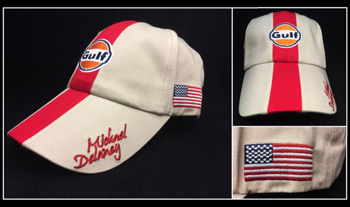 Casquette Gulf Steve McQueen Le Mans Logo Gulf et signature Michael Delaney Logos vintage et drapeau USA brodés Couleur beige / bande rouge Matière 100% coton Taille réglable Unisexe 29,90 € TTC / Incl. Taxes
