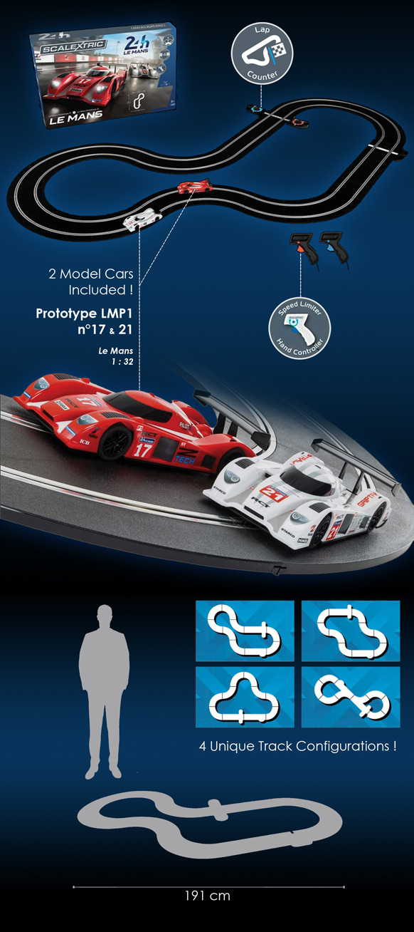 Circuit Electrique Scalextric - Prototype LMP1 24h du Mans Options de mise à niveau vers Digital & App Race Control (ARC) 2 voitures Prototype LMP1 slot car - 1/32 2 manettes contrôleur de vitesse Longueur de circuit 4,84 m Plus de 4 tracés différents possibles Scalextric C1368 99,95 € TTC / Incl. Taxes