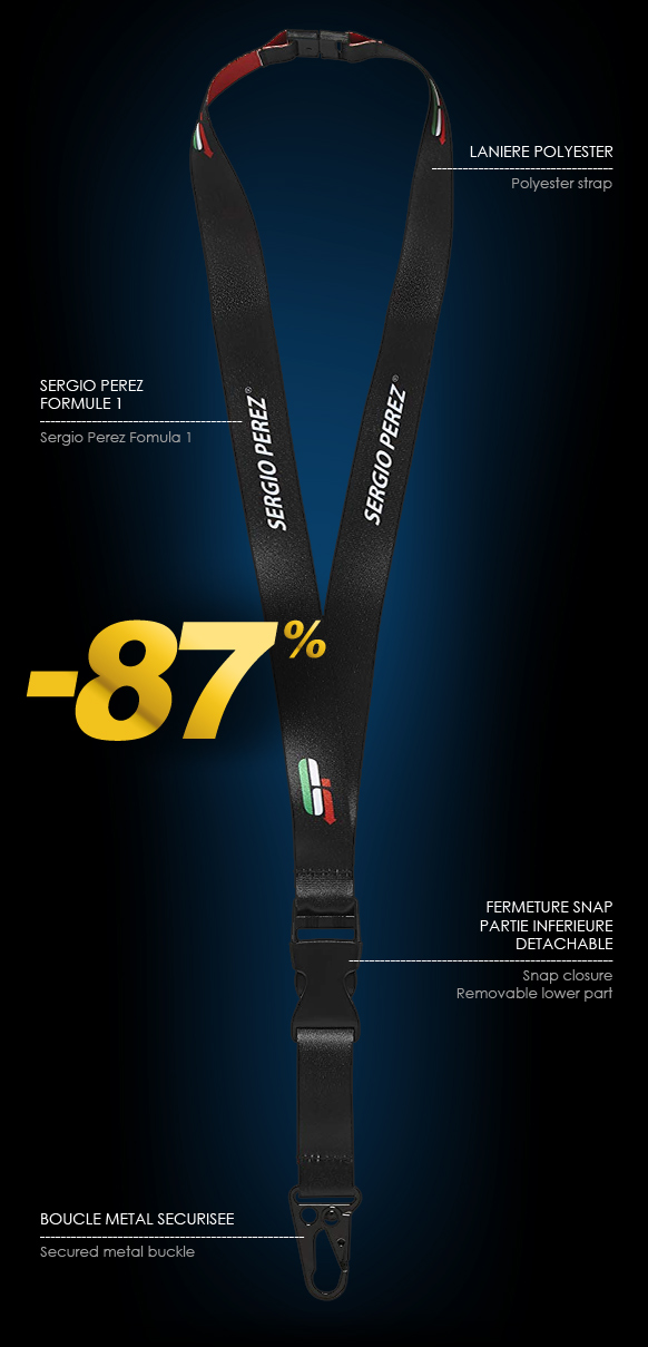 Porte-clés lanière Sergio Perez F1 Matière 100% Polyester - Boucle métal - Fermeture snap Dimensions 15 x 5 x 5 cm - Couleur Noir / Blanc Force India 263491008-100