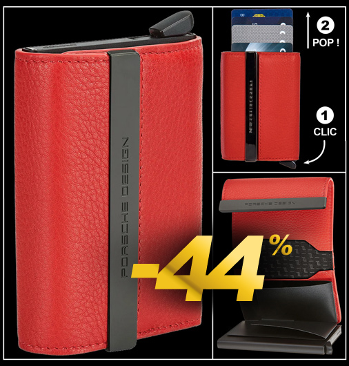 Portefeuille / Porte-cartes Cuir Porsche Design Pop Up X Secrid Mécanisme d'extraction de 4/6 cartes en un seul mouvement Protection de bloqueur RFID - Matière : 100% Cuir de vache Monogramme Porsche Design gravé sur la plaque en bronze Dimensions fermées : 6,5 x 9,5 x 2 cm - Dimensions ouvertes : 23,5 x 10 cm Porsche Design - OSE09800
