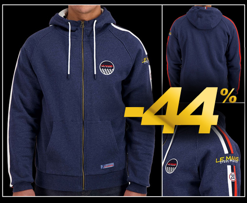 Hoodie homme 24h Le Mans Steve McQueen - Tailles S / M seulement Capuche avec cordon de serrage noir / blanc - 2 poches centrales Fermeture zippée - Matière : 100% coton - Couleur Bleu foncé Le Mans SQ221SSM09-120