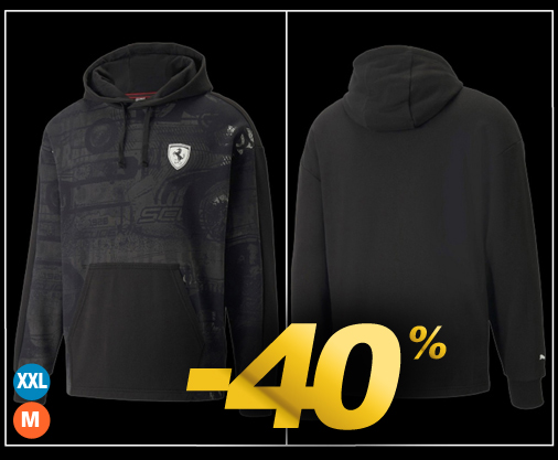 Hoodie homme Ferrari - Tailles M / XL seulement Capuche avec cordon de serrage - Grande poche avec 2 entrées latérales Couleur Noir - Matière 70% coton / 30% coton recyclé Puma 533718-01
